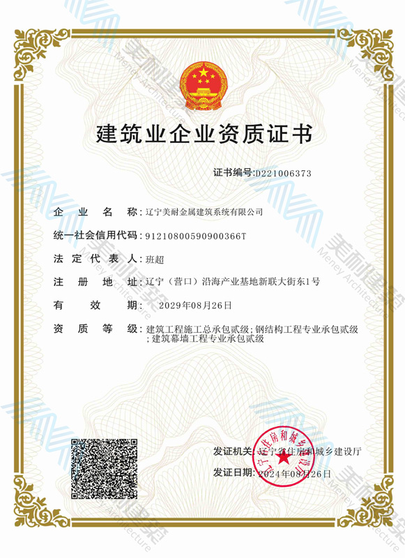 遼寧美耐金屬建筑系統(tǒng)有限公司位于遼寧(營口)沿海產(chǎn)業(yè)基地,專注于預(yù)制金屬建筑系統(tǒng)領(lǐng)域,是一家集工業(yè)建筑設(shè)計(jì)、制作、施工及相關(guān)的技術(shù)咨詢與服務(wù)為一體的綜合性服務(wù)企業(yè)。作為國家鋼結(jié)構(gòu)協(xié)會(huì)會(huì)員、中國建筑金屬結(jié)構(gòu)協(xié)會(huì)會(huì)員單位與國家高新技術(shù)企業(yè),美耐建筑集建筑工程施工總承包、鋼結(jié)構(gòu)工程專業(yè)承包等多種資質(zhì)于一身,并擁有22項(xiàng)鋼結(jié)構(gòu)建筑領(lǐng)域?qū)@?項(xiàng)軟件著作權(quán)。